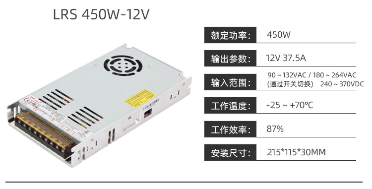 LRS450W系列专用电源特性:交流输入范围通过开关切换,可承受300VAC浪涌输入5秒,保护种类:短路/过负载/过电压/过温度,内置直流风扇强制风冷,具有冷却风扇开/关控制,超小体积1U低外型,可承受5G振动测试,100%满载老化测试,LED 电源指示,工作温度可达70℃,低成本,高效率,高寿命和高可靠度,3年保固