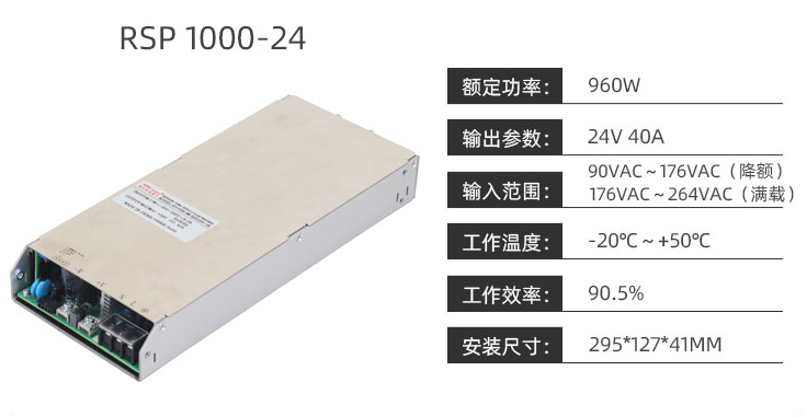 开关电源RSP1000功能特点: 1. 高效率 :减少能耗损耗,符合节能减排要求,为客户节省电费。 2.高功率密度 :可节省客户空间,降低系统成本。 3.输入谐波 :减少对电网的污染,更高的电网适应能力。 :4.宽输入电压范围,宽输出电压范围 ,适合大多数不同输入、输出电压场合。 5.宽工作温度范围 :宽工作温度范围满足大多数严酷的工作环境。 6.输入抗高压冲击功能 :极大提高系统的可靠性。