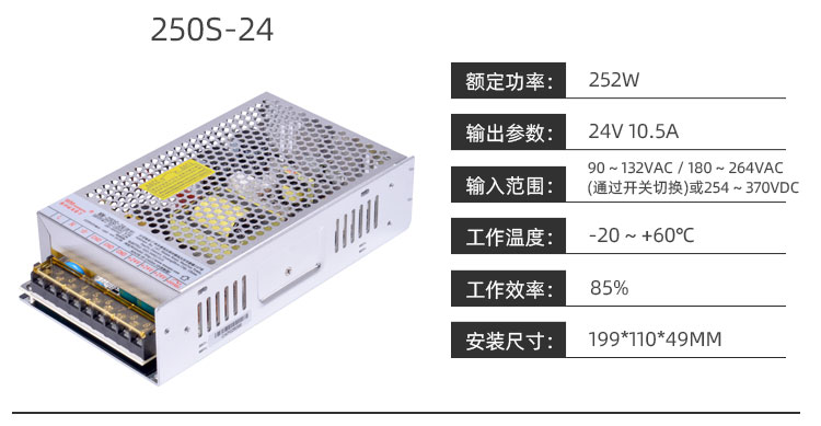 输入范围:90 ~ 132VAC / 180 ~ 264VAC(通过开关切换) 254 ~ 370VDC