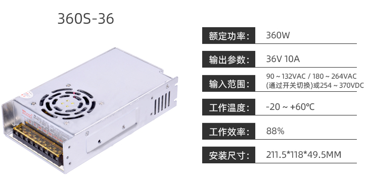 输入范围:90 ~ 132VAC / 180 ~ 264VAC(通过开关切换) 254 ~ 370VDC