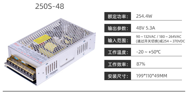 250S开关电源-旺马开关电源特性:交流输入范围通过开关切换,保护种类:短路/过负载/过电压,自然风冷,可承受 300VAC 浪涌输入5 秒,具有恒流限制电路,100%满载老化测试,LED 电源指示,开关工作频率:54KHz,低成本,高可靠度,2 年保固