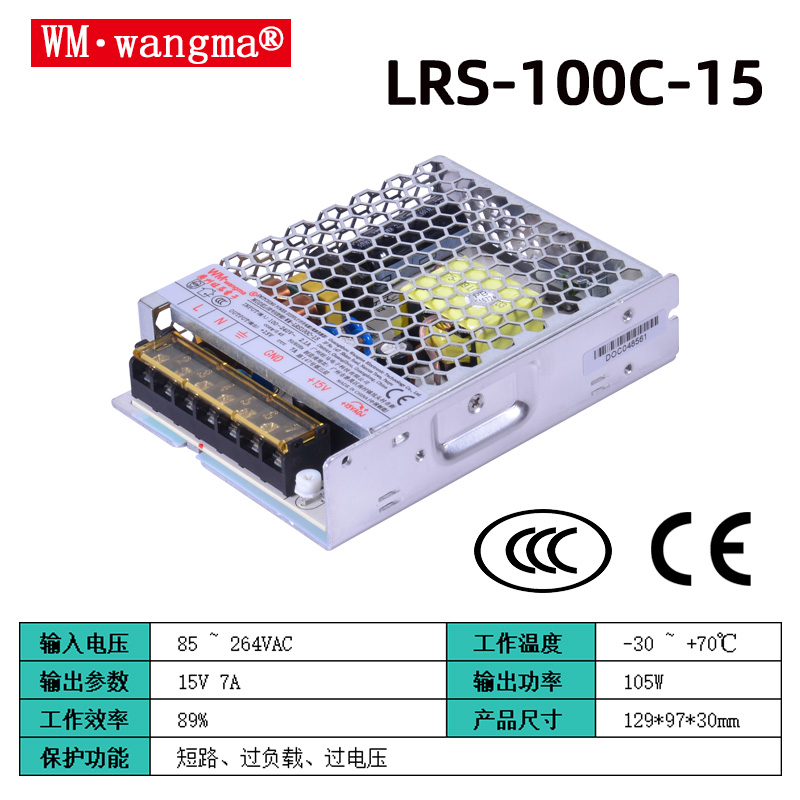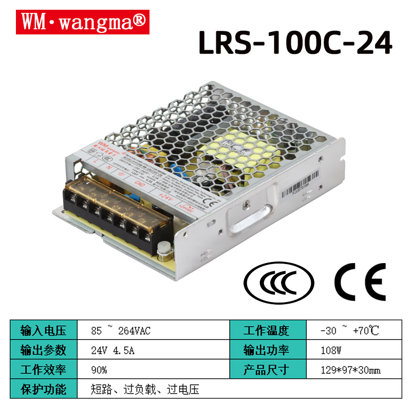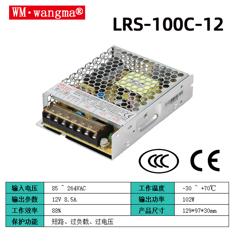 型号后缀:常见输出电压有 12V(8.3A,WM-LRS100C-12)、24V(4.2A,WM-LRS100C-24),另有 5V、15V、48V 等定制规格;