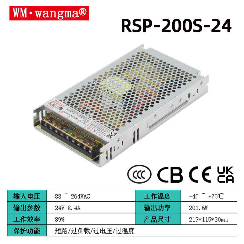 功率与输出:200W 单路输出;主流型号有 WM-RSP200-12开关电源(12V/16.7A)、WM-RSP200-24开关电源(24V/8.3A);输出电压可微调(如 24V 可在 22.8–26.4V 范围);纹波低,适合精密设备。